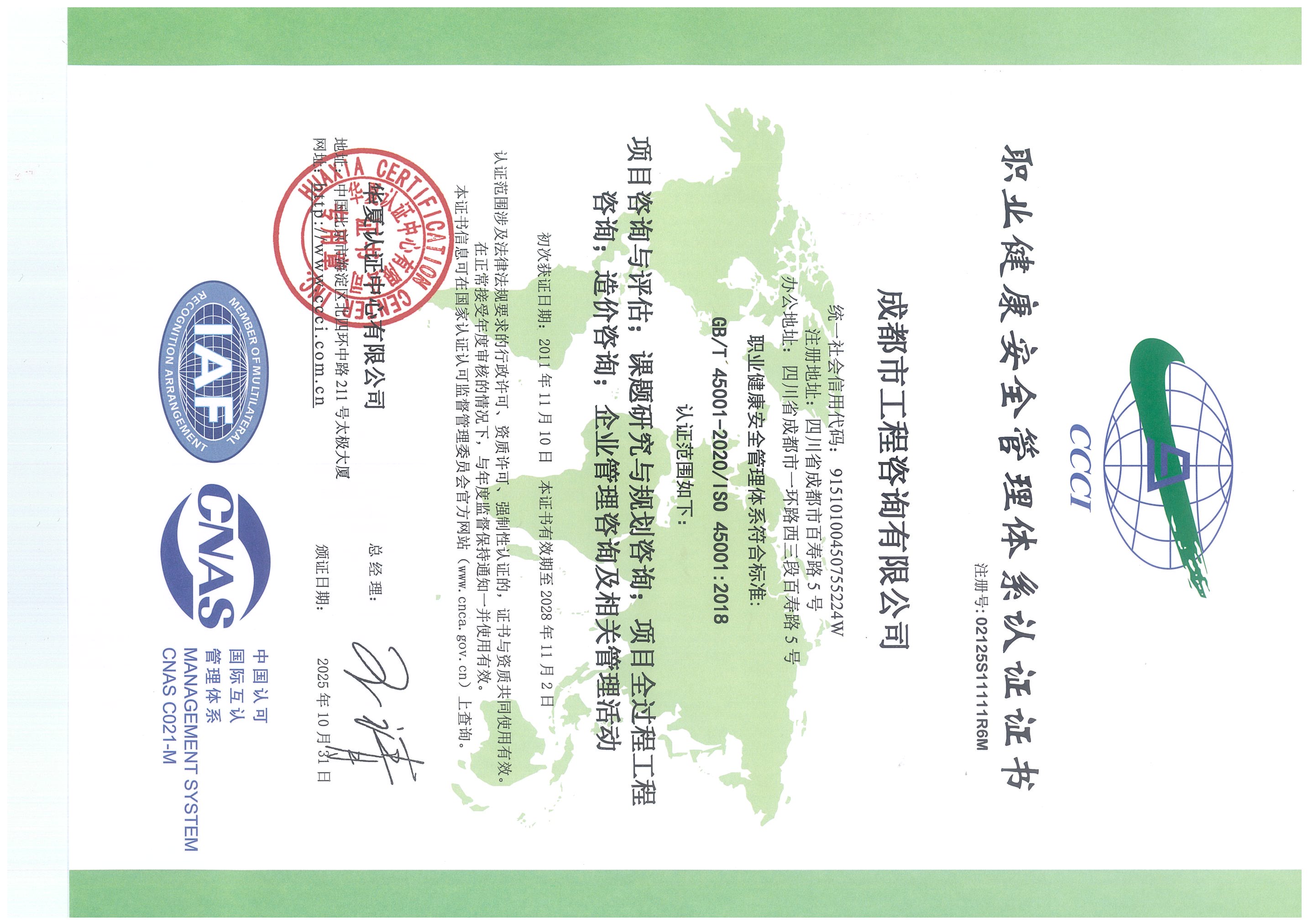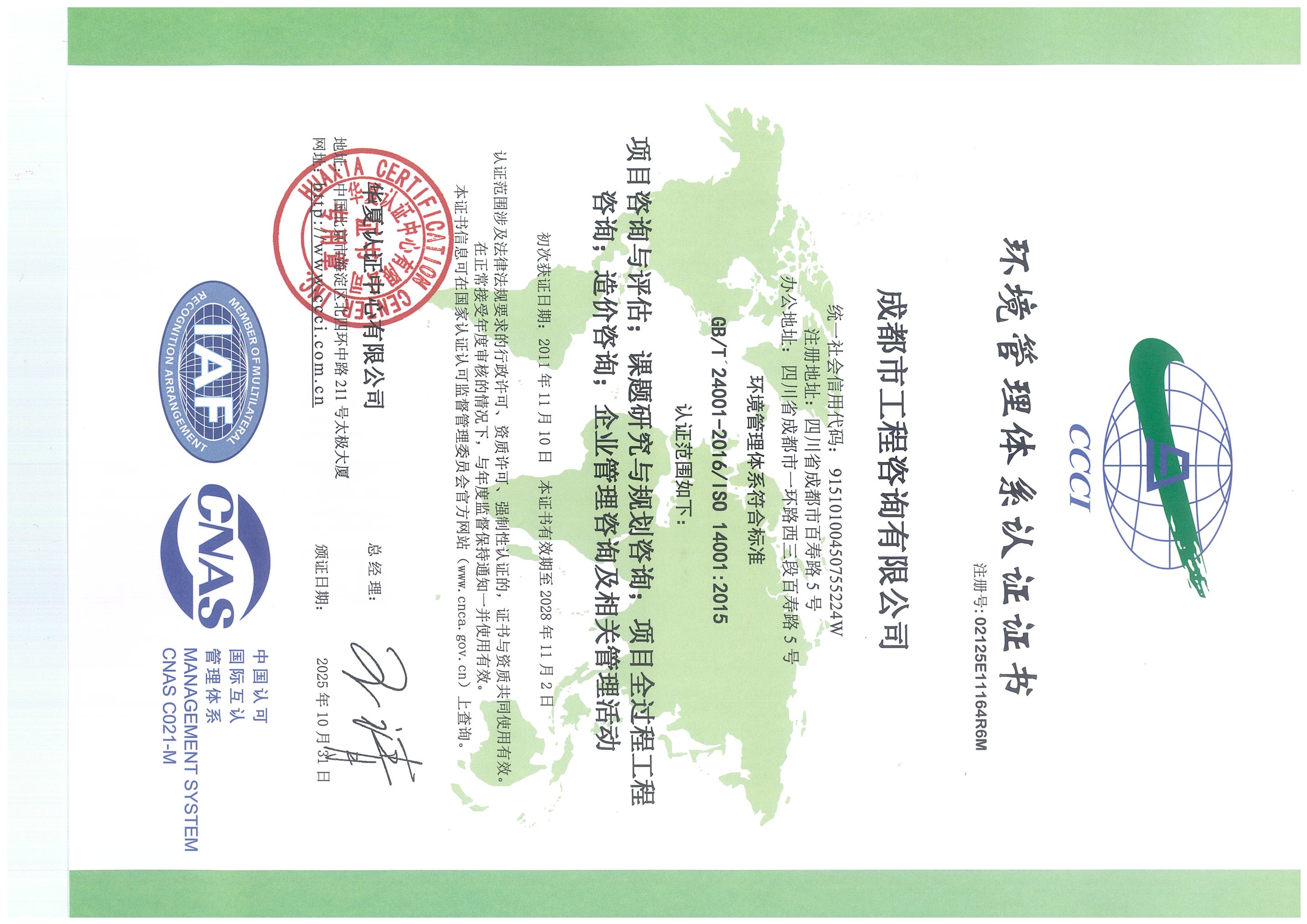 公司擁有工程咨詢甲級綜合資信、甲級專業(yè)資信和PPP甲級專項資信三項甲級資信證書和工程造價資質。甲級綜合資信由建筑,水利水電,農(nóng)業(yè)、林業(yè),電子、信息工程(含通信、廣電、信息化),市政公用工程,生態(tài)建設和環(huán)境工程,公路,其他(節(jié)能)8個甲級專業(yè)資信和電力(含火電、水電、核電、新能源),輕工、紡織,水文地質、工程測量、巖土工程,建材,鐵路、城市軌道交通,其他(土地整理)和其他(旅游工程)7個其他專業(yè)組成。公司現(xiàn)已通過了GB/T19001-2016/ISO9001:2015質量管理體系、GB/T24001-2016/ISO14001:2015環(huán)境管理體系和GB/T45001-2020/ISO45001:2018職業(yè)健康安全管理體系認證。公司目前是四川省內唯一同時持有甲級綜合資信、甲級專業(yè)資信和PPP甲級專項資信證書的綜合性咨詢機構,是四川省及成都市發(fā)展改革部門以及天府新區(qū)、東部新區(qū)、高新區(qū)、武侯區(qū)等20余個區(qū)(市)縣的政府投資項目咨詢服務機構。