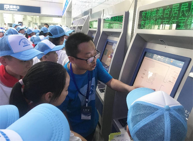 在雅安火車站行政辦公樓旁的操場上,運(yùn)通公司工作人員就雅安火車站相關(guān)情況向孩子們進(jìn)行了簡單介紹,對(duì)孩子們提出的問題進(jìn)行了一一解答。下午4點(diǎn)13分,伴隨響亮的鳴笛聲,一輛動(dòng)車駛出站臺(tái),孩子們歡呼雀躍,興奮不已。在雅安火車站售票大廳,運(yùn)通公司員工向孩子們講解了自助購、取票操作流程。