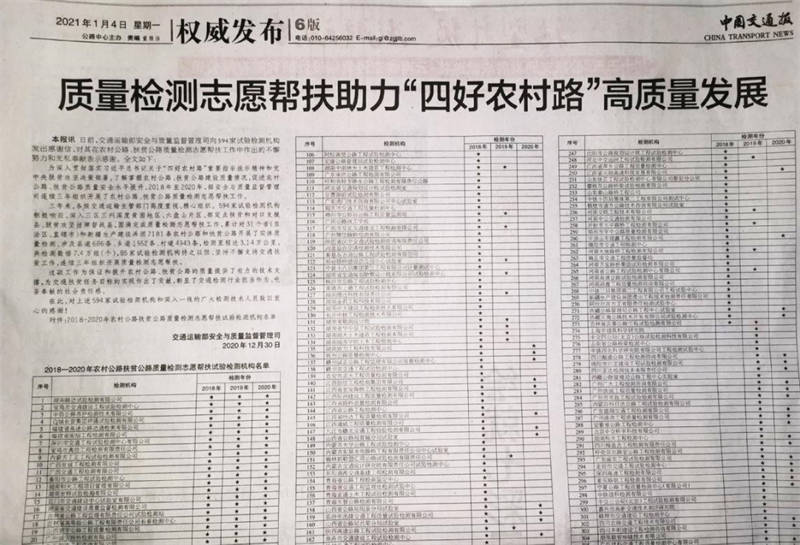 2020年12月30日,佳岳公司收到來自交通運(yùn)輸部安全與質(zhì)量監(jiān)督管理司的感謝信,并在1月4日中國交通報6版以《質(zhì)量檢測志愿幫扶助力“四好農(nóng)村路”高質(zhì)量發(fā)展》為題進(jìn)行了專題報道,對交建集團(tuán)佳岳檢測公司在農(nóng)村公路、扶貧公路質(zhì)量檢測志愿幫扶工作中作出的不懈努力和無私奉獻(xiàn)表示感謝。