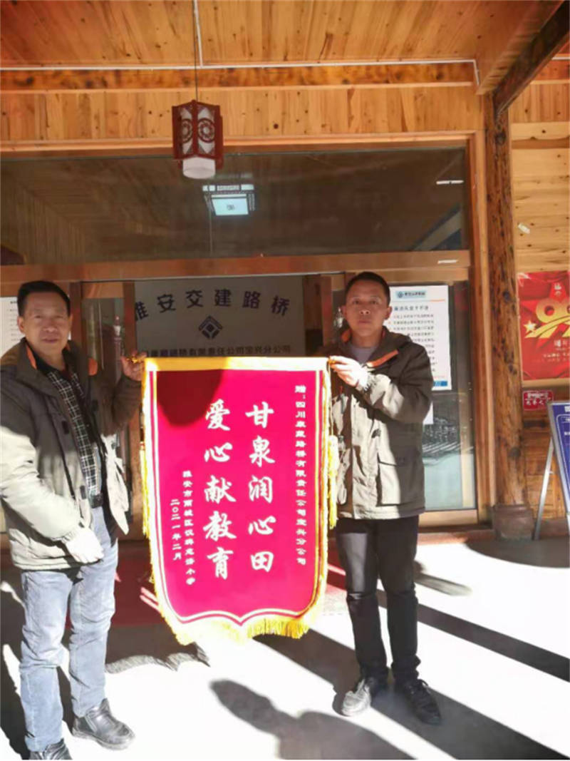 2月19日,雅安市雨城區(qū)第四小學(xué)漢碑校區(qū)將一面繡有“甘泉潤心田、愛心獻(xiàn)教育 ”的錦旗送到交建路橋公司寶興項(xiàng)目部,感謝路橋公司向漢碑校區(qū)捐贈5萬元基金用以建設(shè)該校勞動教育烹飪基地。