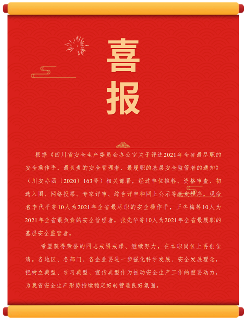 此次評(píng)選活動(dòng),最終命名“全省最盡職的安全操作手、最負(fù)責(zé)的安全管理者、最履職的基層安全監(jiān)管者”各10名。彭聯(lián)平通過(guò)單位自薦、資格審查、初選入圍、網(wǎng)絡(luò)投票、專(zhuān)家評(píng)審、綜合評(píng)審和網(wǎng)上公示層層選拔,最終獲得“2021年全省最盡職的安全操作手”稱(chēng)號(hào),是雅安市唯一獲此殊榮的個(gè)人。