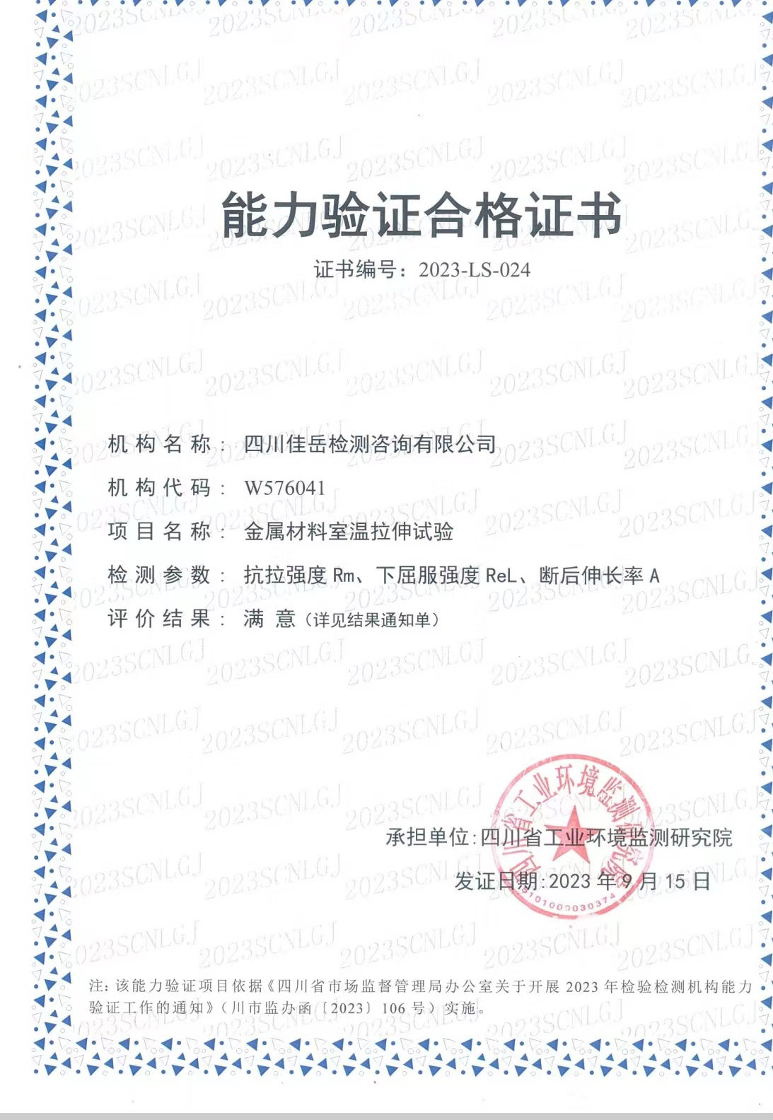 近日,四川省市場監(jiān)督管理局公布2023年能力驗證結(jié)果,雅安交建集團(tuán)所屬四川佳岳檢測咨詢公司參加的保溫材料導(dǎo)熱系數(shù)檢測、室內(nèi)環(huán)境污染物甲醛檢測、水泥物理性能檢測、金屬材料室溫拉伸試驗等5項能力驗證,評價結(jié)果均為“滿意”。