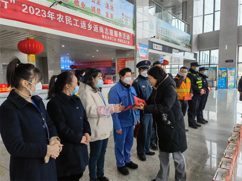 在雅安市汽車客運站,李蓉調(diào)研了工會系統(tǒng)2023年農(nóng)民工返鄉(xiāng)返崗志愿服務(wù)活動開展情況,看望慰問了民警、汽車客運站職工、保安保潔等春運一線人員,向大家致以新春祝福。李蓉要求,全市各級工會組織要統(tǒng)籌資源、精心組織,認真做好送溫暖、農(nóng)民工返鄉(xiāng)返崗志愿服務(wù)活動等工作,切實把黨和政府的關(guān)心關(guān)懷與工會組織的溫暖送到廣大職工群眾心坎上。