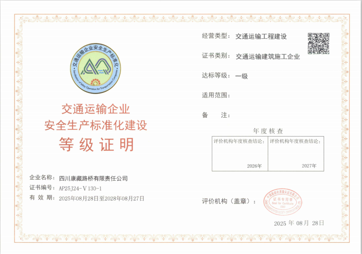 近日,經(jīng)交通運(yùn)輸部交通運(yùn)輸企業(yè)安全生產(chǎn)標(biāo)準(zhǔn)化評(píng)價(jià)機(jī)構(gòu)綜合評(píng)定,康藏路橋公司獲評(píng)安全標(biāo)準(zhǔn)化一級(jí)企業(yè)并取得證書,標(biāo)志其安全生產(chǎn)管理體系獲國(guó)家最高標(biāo)準(zhǔn)認(rèn)可。