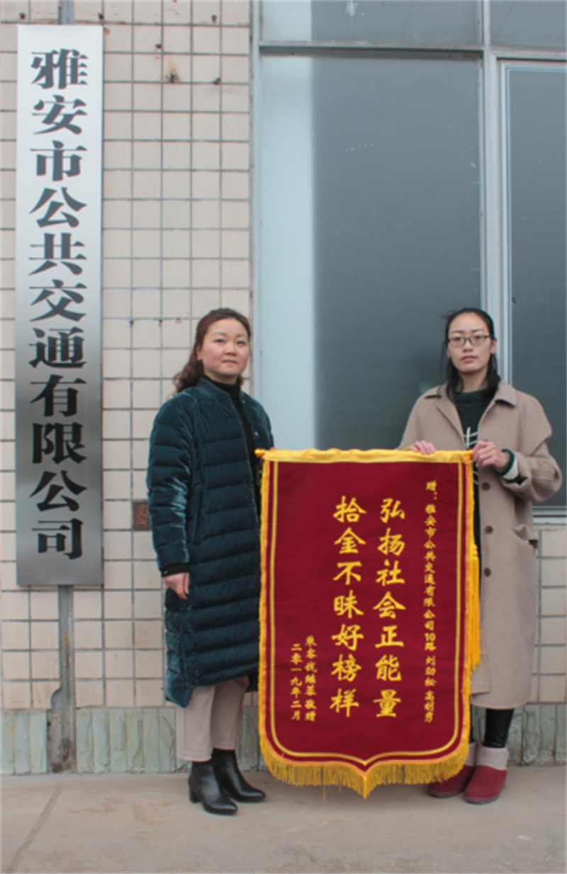 “請一定把我們的感謝帶給駕駛員和發(fā)班員!2月14日下午17時15分左右,一名手拿寫著“拾金不昧好榜樣弘揚社會正能量”錦旗的市民錢續(xù)露來到雅安市公共交通有限公司,將錦旗送到了經(jīng)理助理方媛手上,請她把感謝之意轉(zhuǎn)達給10路公交車駕駛員劉進松和發(fā)班員高胡秀。