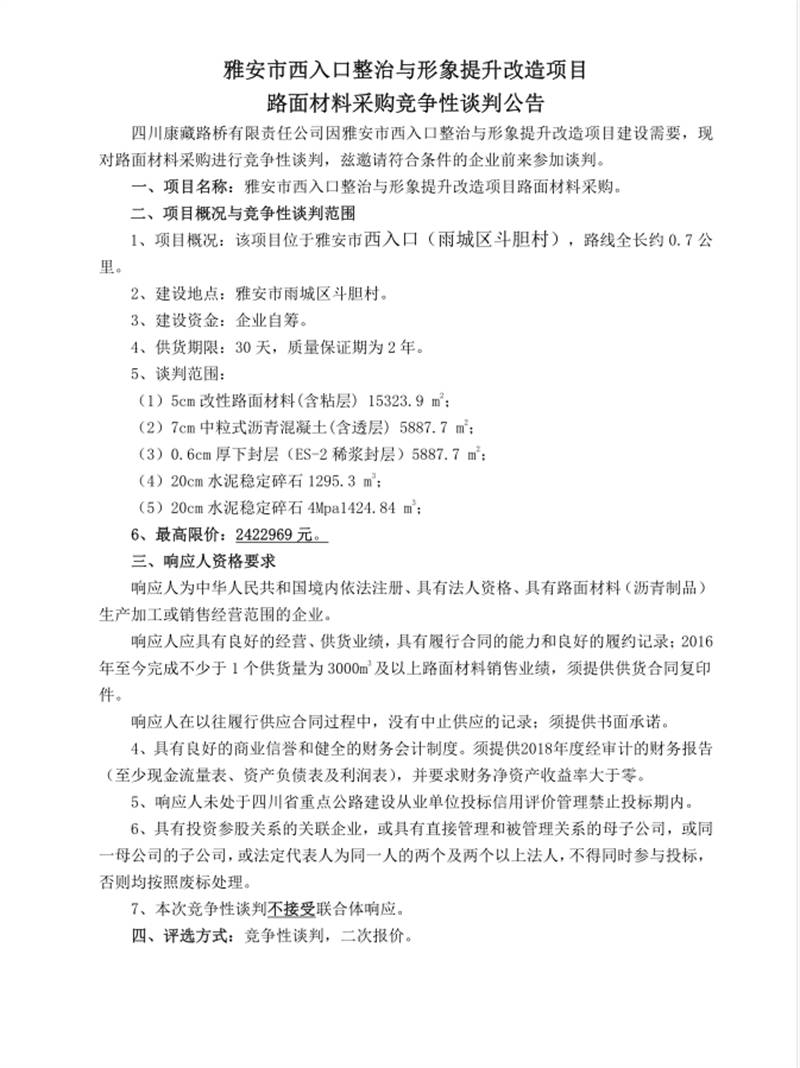 雅安市西入口整治與形象提升改造項(xiàng)目路面材料采購競爭性談判公告