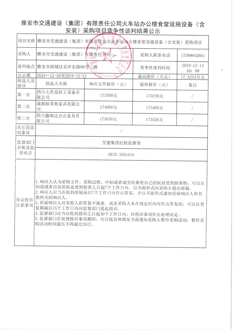 雅安市交通建設(shè)(集團(tuán))有限責(zé)任公司火車站辦公樓食堂設(shè)施設(shè)備(含安裝)采購(gòu)項(xiàng)目競(jìng)爭(zhēng)性談判結(jié)果公示