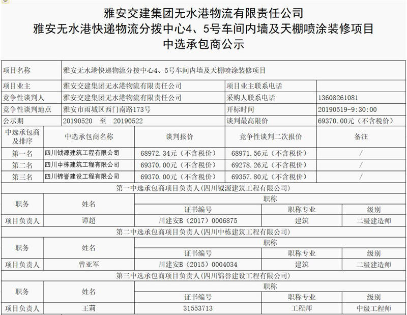 雅安無水港快遞物流分撥中心4、5號車間內(nèi)墻及天棚噴涂裝修項(xiàng)目中選承包商公示