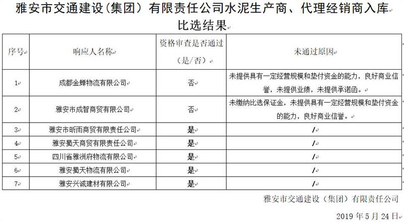 雅安市交通建設(shè)(集團(tuán))有限責(zé)任公司水泥生產(chǎn)商、代理經(jīng)銷(xiāo)商入庫(kù)比選結(jié)果公示