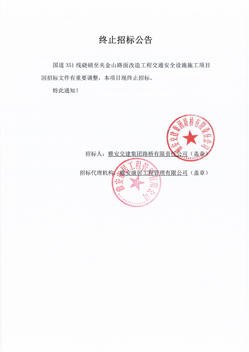 雅安交建集團(tuán)路橋有限責(zé)任公司國(guó)道351線磽磧至夾金山段路面改造工程交通安全設(shè)施施工項(xiàng)目終止招標(biāo)公告