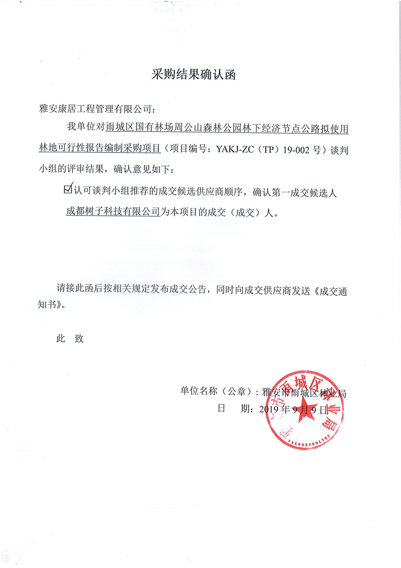 雅安市雨城區(qū)林業(yè)局雨城區(qū)國(guó)有林場(chǎng)周公山森林公園林下經(jīng)濟(jì)節(jié)點(diǎn)公路擬使用林地可行性報(bào)告編制采購(gòu)項(xiàng)目競(jìng)爭(zhēng)性談判結(jié)果公示