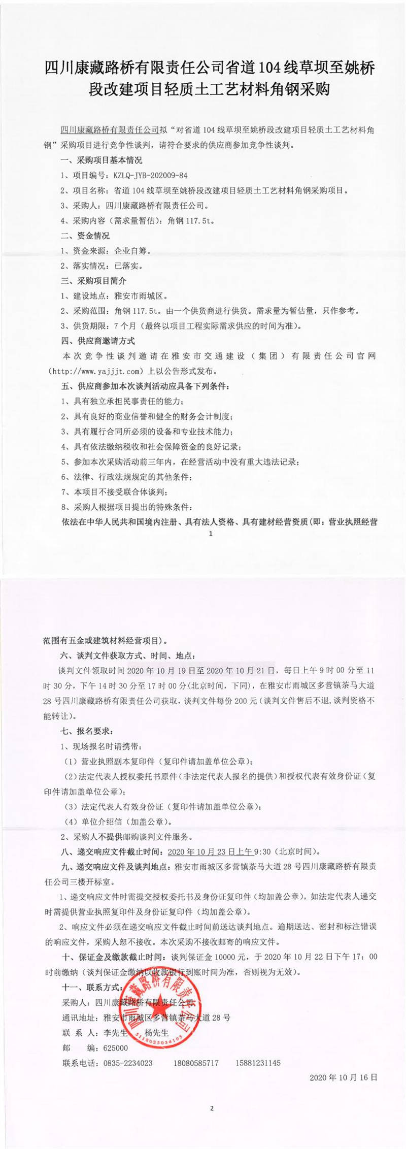 四川康藏路橋有限責(zé)任公司省道104線草壩至姚橋段改建項(xiàng)目輕質(zhì)土工藝材料角鋼采購(gòu)競(jìng)爭(zhēng)性談判公告