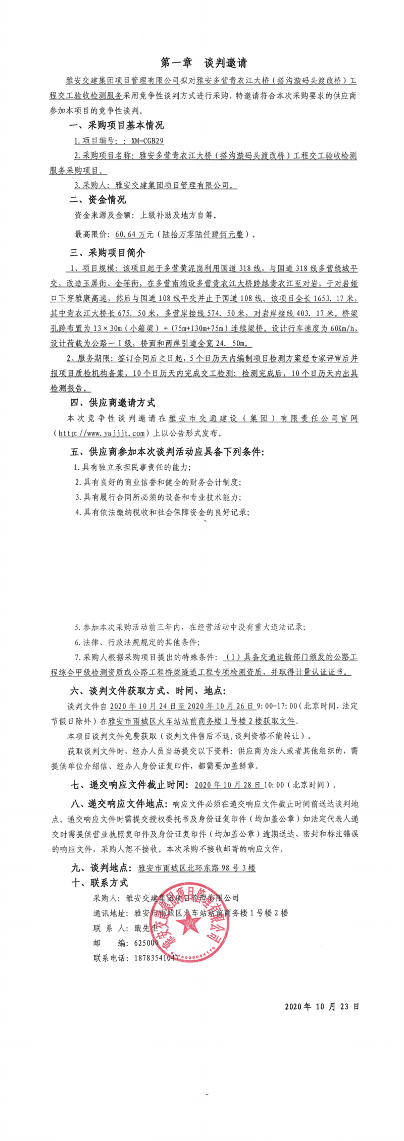 雅安交建集團(tuán)項(xiàng)目管理有限公司雅安多營(yíng)青衣江大橋(搭溝漩碼頭渡改橋)工程交工驗(yàn)收檢測(cè)服務(wù)采購項(xiàng)目競(jìng)爭(zhēng)性談判公告