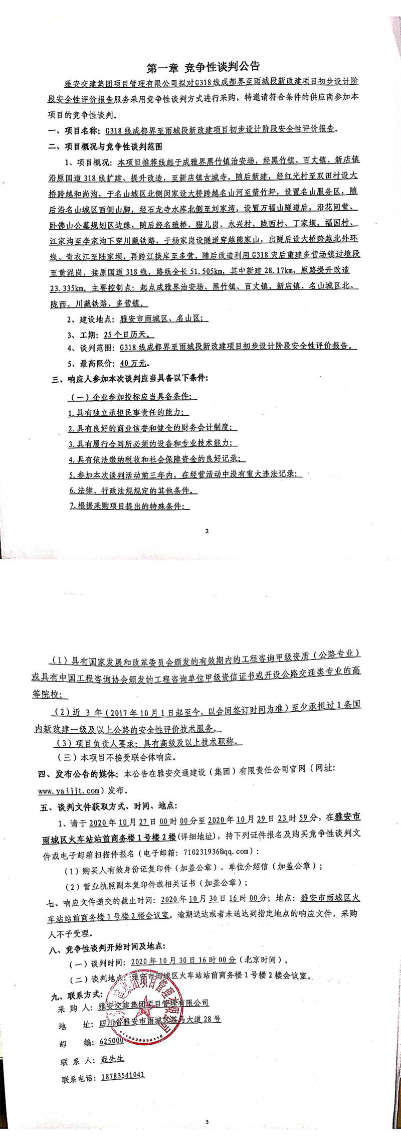 雅安交建集團(tuán)項目管理有限公司G318線成都界至雨城段新改建項目初步設(shè)計階段安全性評價報告競爭性談判公告