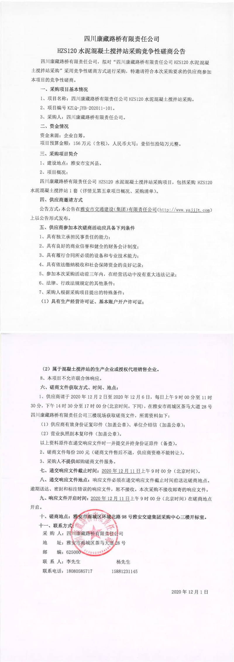 四川康藏路橋有限責(zé)任公司HZS120水泥混凝土攪拌站采購競爭性磋商公告