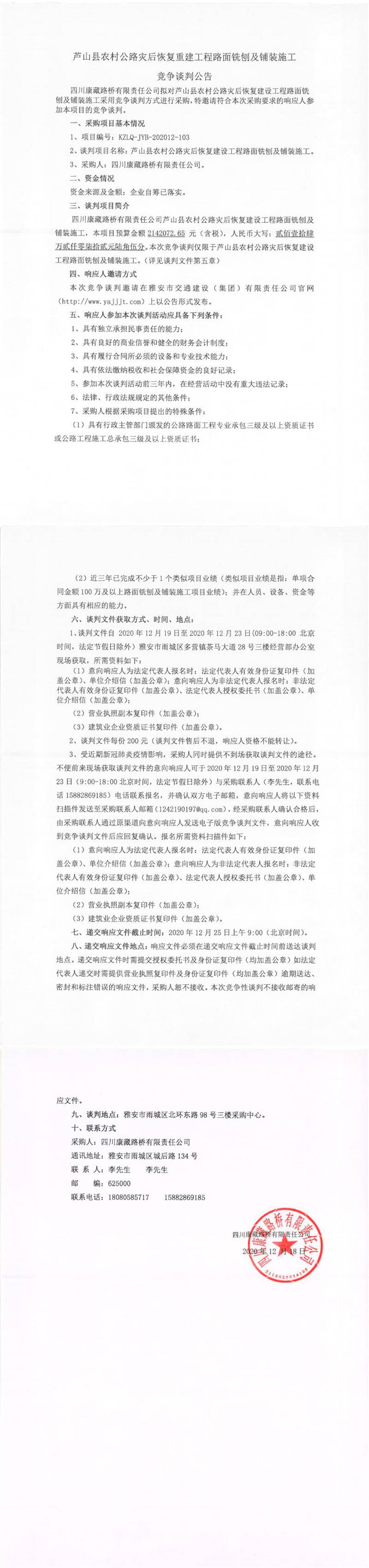 四川康藏路橋有限責任公司蘆山縣農(nóng)村公路災后恢復建設工程路面銑刨及鋪裝施工競爭談判公告