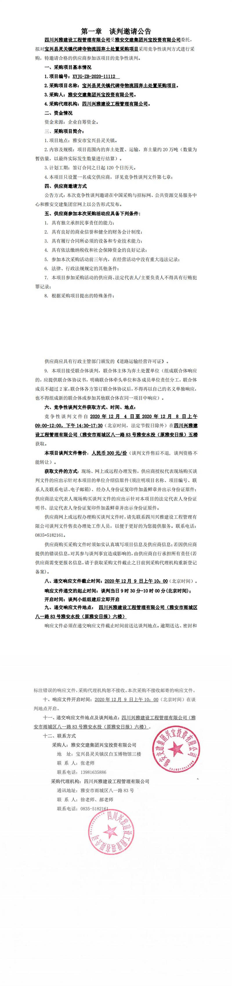 雅安交建集團(tuán)興寶投資有限公司寶興縣靈關(guān)鎮(zhèn)代碑寺物流園棄土處置采購項(xiàng)目談判公告