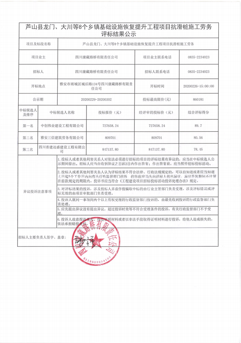 四川康藏路橋有限責(zé)任公司蘆山縣龍門、大川等8個鄉(xiāng)鎮(zhèn)基礎(chǔ)設(shè)施恢復(fù)提升工程項目抗滑樁施工勞務(wù)評標(biāo)結(jié)果公示
