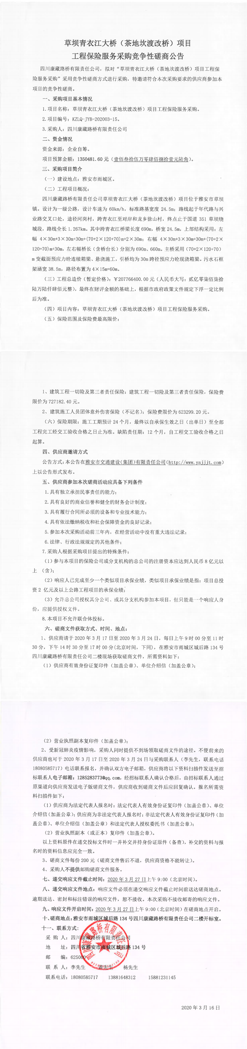 四川康藏路橋有限責(zé)任公司草壩青衣江大橋(茶地坎渡改橋)項(xiàng)目工程保險(xiǎn)服務(wù)采購(gòu)競(jìng)爭(zhēng)性磋商公告