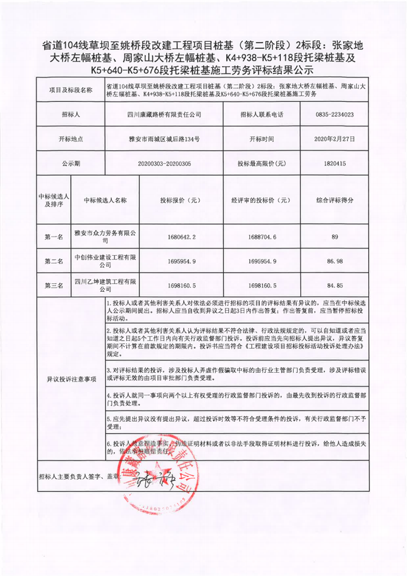 四川康藏路橋有限責(zé)任公司省道104線草壩至姚橋段改建工程項(xiàng)目樁基(第二階段)2標(biāo)段:張家地大橋左幅樁基、周家山大橋左幅樁基、K4+938-K5+118段托梁樁基及K5+640-K5+676段托梁樁基施工勞務(wù)評(píng)標(biāo)結(jié)果公示