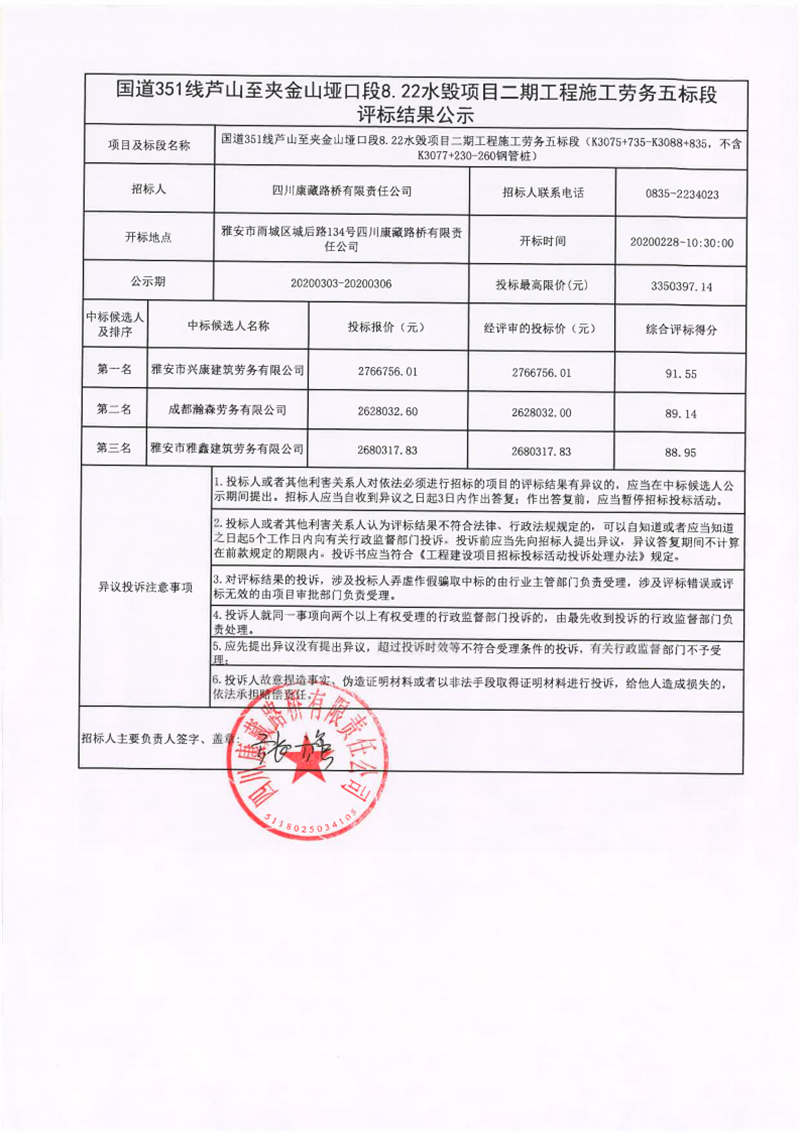 四川康藏路橋有限責(zé)任公司國道351線蘆山至夾金山埡口段8.22水毀項(xiàng)目二期工程施工勞務(wù)五標(biāo)段評標(biāo)結(jié)果公示