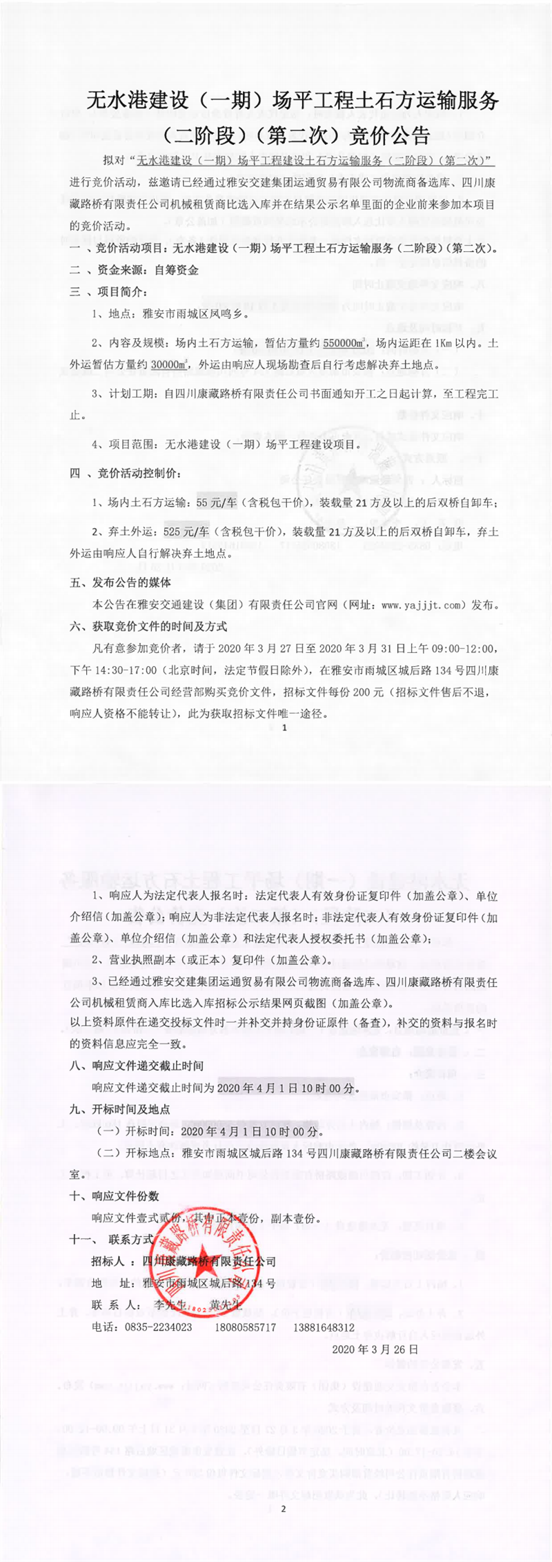 四川康藏路橋有限責(zé)任公司無(wú)水港建設(shè)(一期)場(chǎng)平工程建設(shè)土石方運(yùn)輸服務(wù)(二階段)(第二次)競(jìng)價(jià)公告