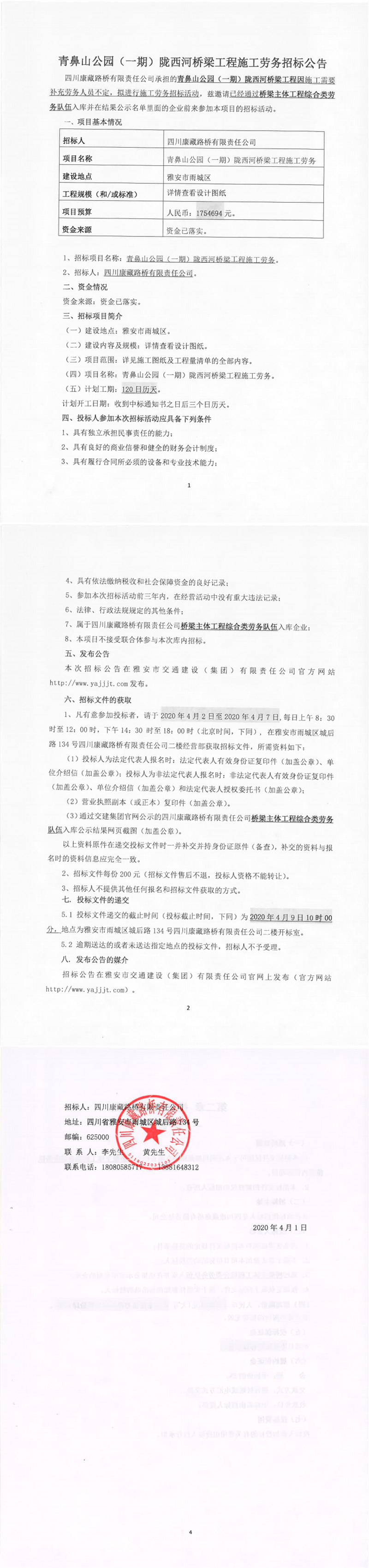 四川康藏路橋有限責(zé)任公司青鼻山公園(一期)隴西河橋梁工程施工勞務(wù)招標公告