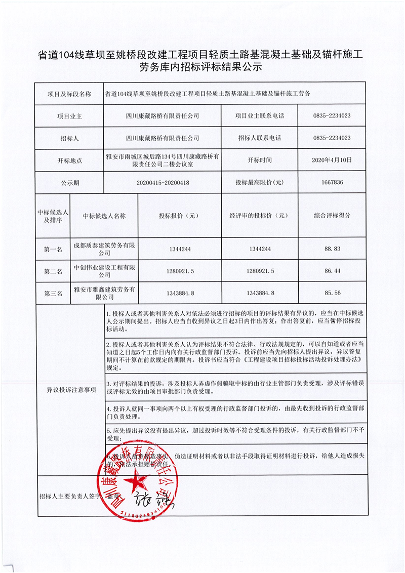 四川康藏路橋有限責任公司省道104線草壩至姚橋段改建工程項目輕質(zhì)土路基混凝土基礎(chǔ)及錨桿施工勞務(wù)庫內(nèi)招標評標結(jié)果公示