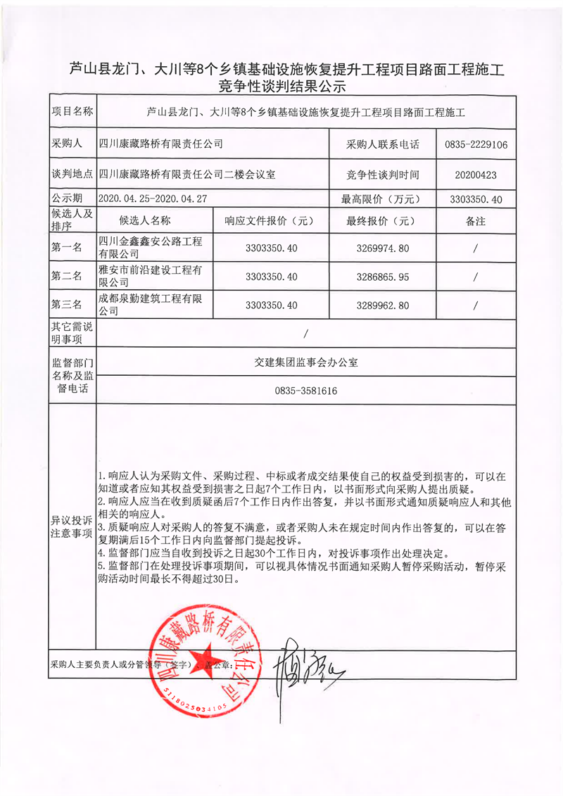 四川康藏路橋有限責(zé)任公司蘆山縣龍門、大川等8個鄉(xiāng)鎮(zhèn)基礎(chǔ)設(shè)施恢復(fù)提升工程項(xiàng)目路面工程施工競爭性談判結(jié)果公示
