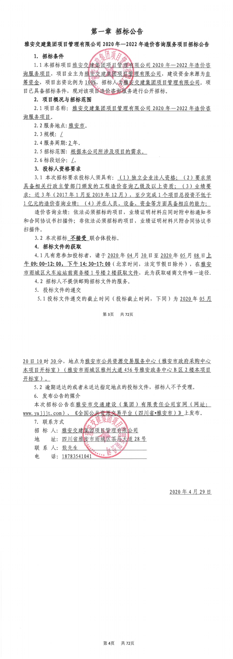 雅安交建集團項目管理有限公司2020年-2022年造價咨詢服務(wù)項目招標公告
