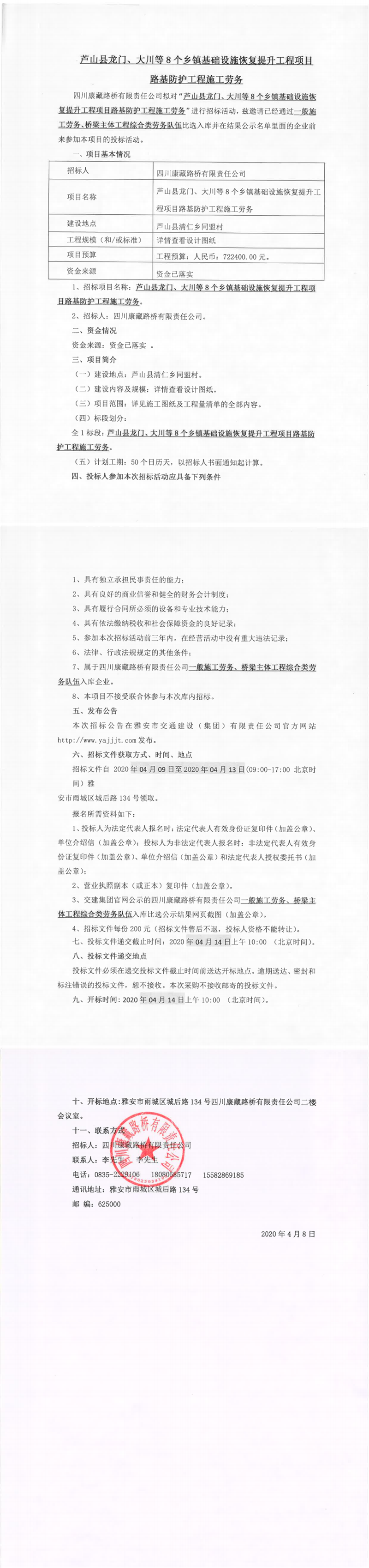 四川康藏路橋有限責任公司蘆山縣龍門、大川等8個鄉(xiāng)鎮(zhèn)基礎(chǔ)設(shè)施恢復(fù)提升工程項目路基防護工程施工勞務(wù)招標公告