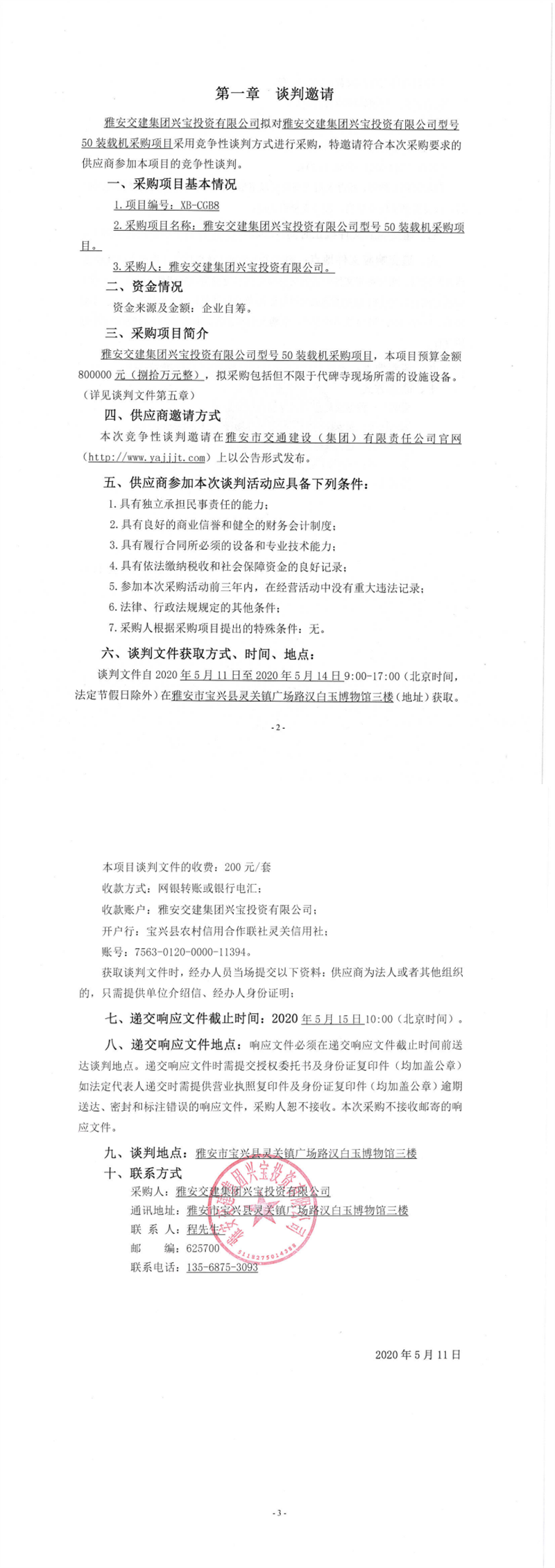 雅安交建集團興寶投資有限公司型號50裝載機采購項目競爭性談判公告