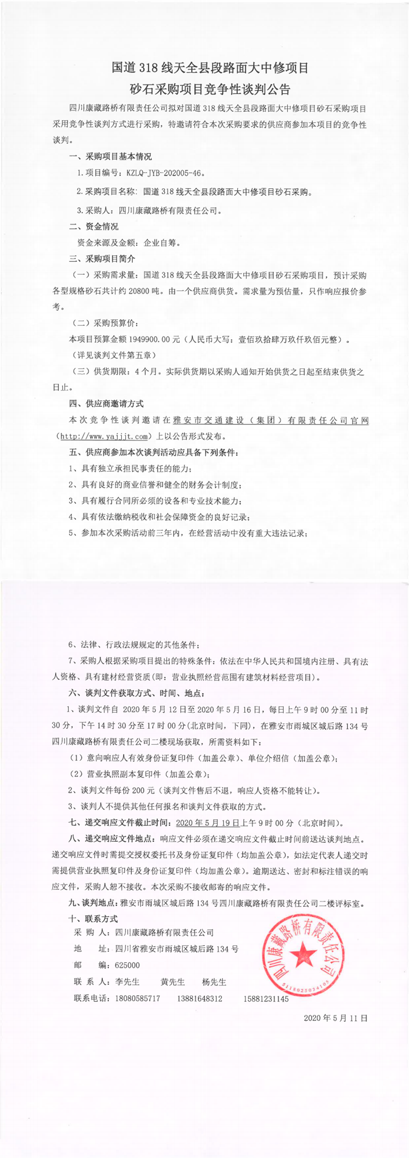 四川康藏路橋有限責(zé)任公司國道318線天全縣段路面大中修項(xiàng)目砂石采購項(xiàng)目競爭性談判公告