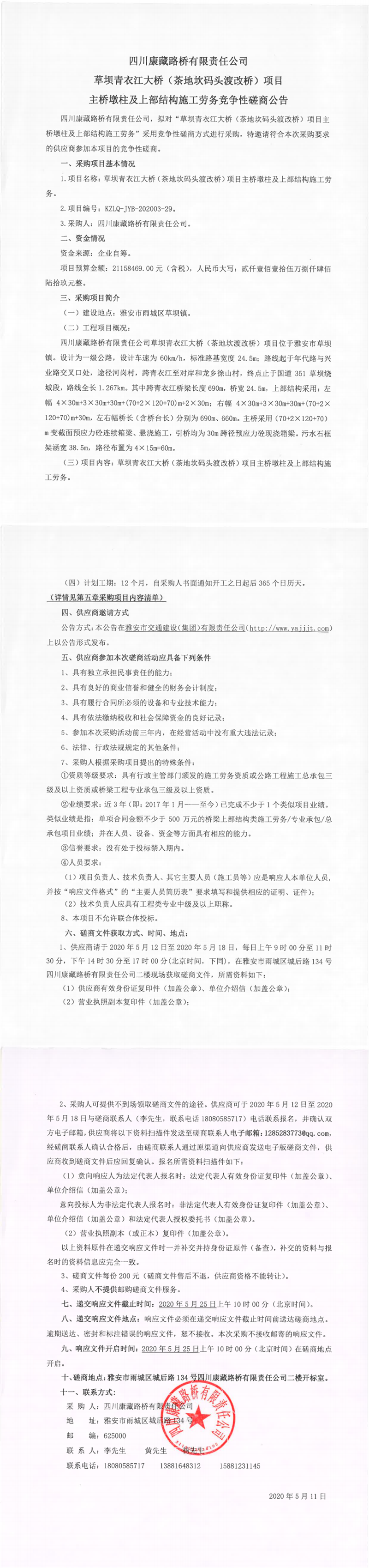 四川康藏路橋有限責任公司草壩青衣江大橋(茶地坎碼頭渡改橋)項目主橋墩柱及上部結構施工勞務競爭性磋商公告