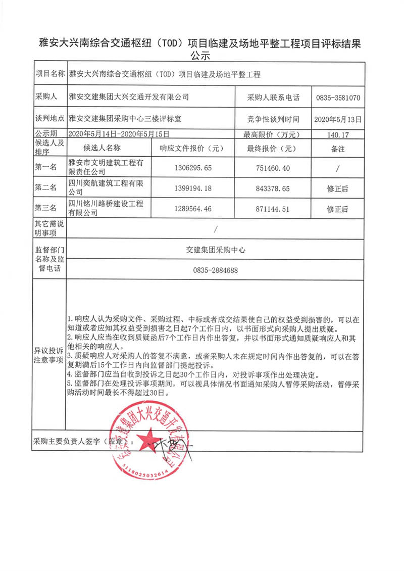 雅安交建集團大興交通開發(fā)有限公司雅安大興南綜合交通樞紐(TOD)項目臨建及場地平整工程項目評標結(jié)果公示