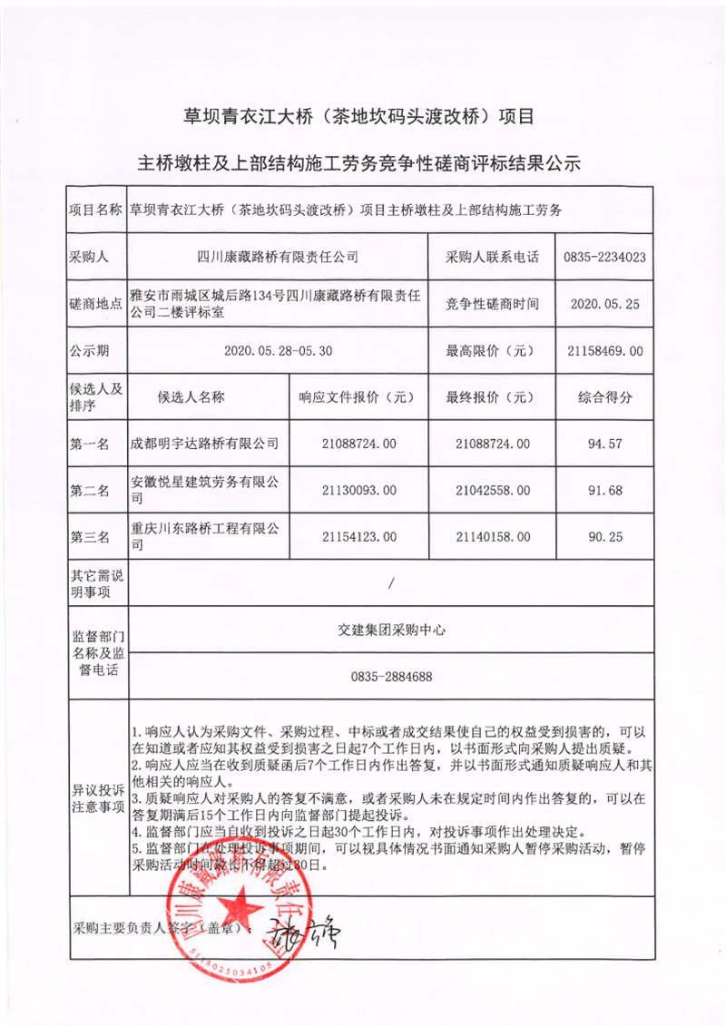 四川康藏路橋有限責任公司草壩青衣江大橋(茶地坎碼頭渡改橋)項目主橋墩柱及上部結(jié)構(gòu)施工勞務競爭性磋商評標結(jié)果公示