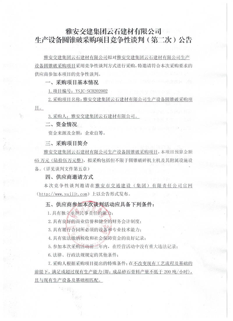 雅安交建集團(tuán)云石建材有限公司生產(chǎn)設(shè)備圓錐破采購項(xiàng)目競爭性談判(第二次)公告