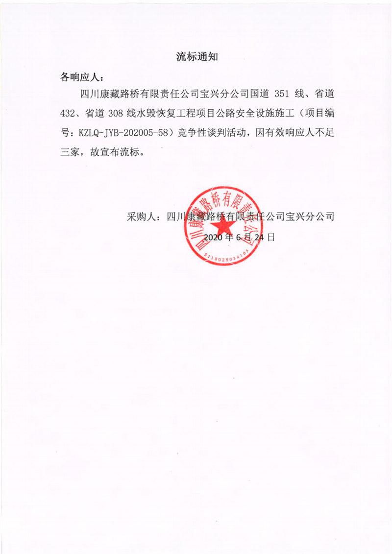 四川康藏路橋有限責(zé)任公司寶興分公司國道351線、省道432線、省道308線水毀修復(fù)工程項(xiàng)目公路安全設(shè)施施工流標(biāo)通知
