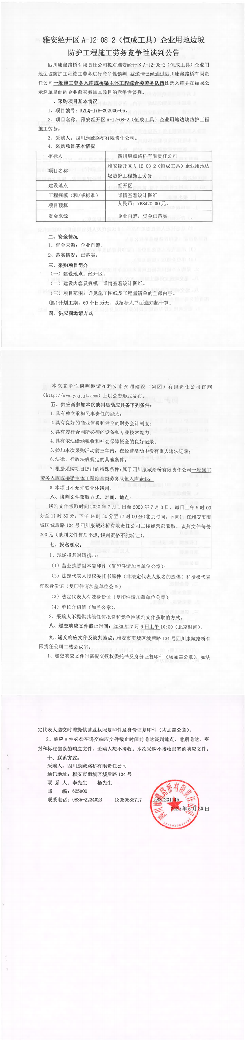 四川康藏路橋有限責任公司雅安經(jīng)開區(qū)A-12-08-2(恒成工具)企業(yè)用地邊坡防護工程施工勞務競爭性談判公告