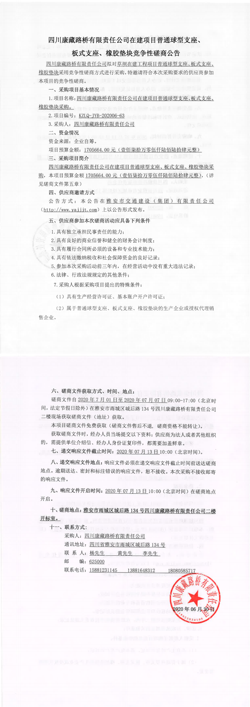 四川康藏路橋有限責(zé)任公司在建項(xiàng)目普通球型支座、板式支座、橡膠墊塊采購競(jìng)爭(zhēng)性磋商公告
