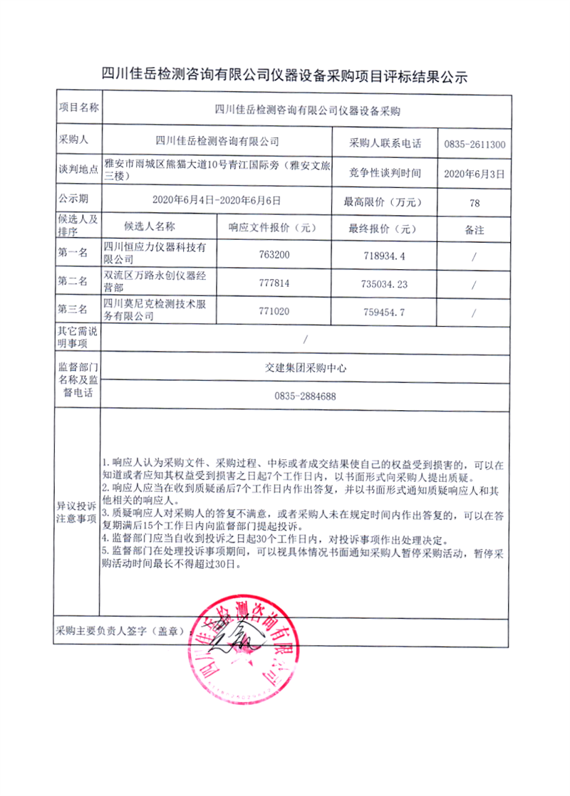 四川佳岳檢測(cè)咨詢有限公司儀器設(shè)備采購項(xiàng)目評(píng)標(biāo)結(jié)果公示