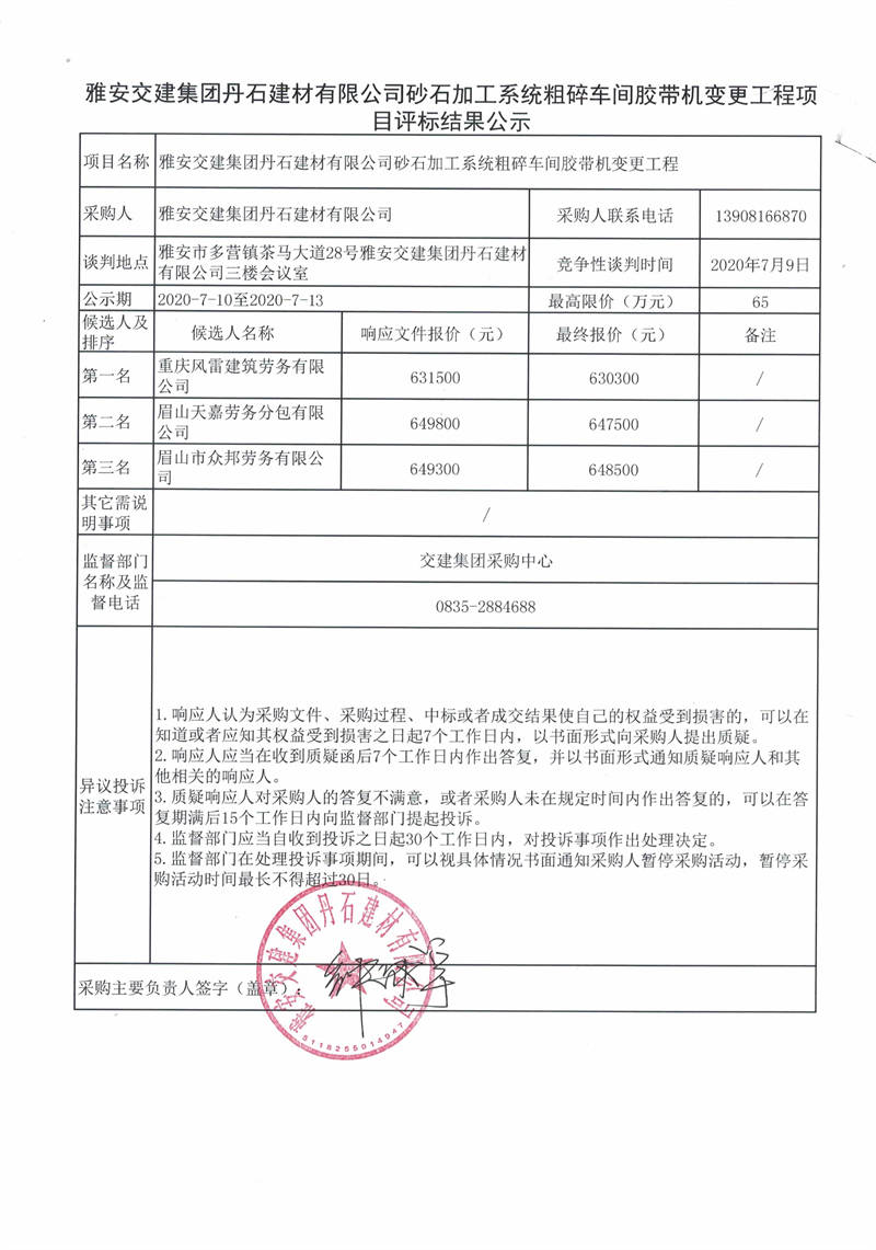 雅安交建集團(tuán)丹石建材有限公司砂石加工系統(tǒng)粗碎車間膠帶機(jī)變更工程項(xiàng)目評(píng)標(biāo)結(jié)果公示