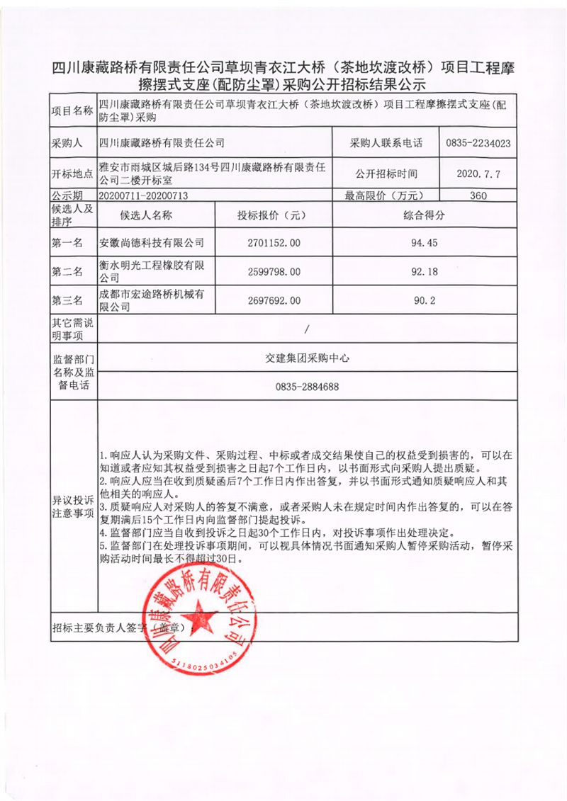 四川康藏路橋有限責任公司草壩青衣江大橋(茶地坎渡改橋)項目工程摩擦擺式支座(配防塵罩)采購公開招標結(jié)果公示