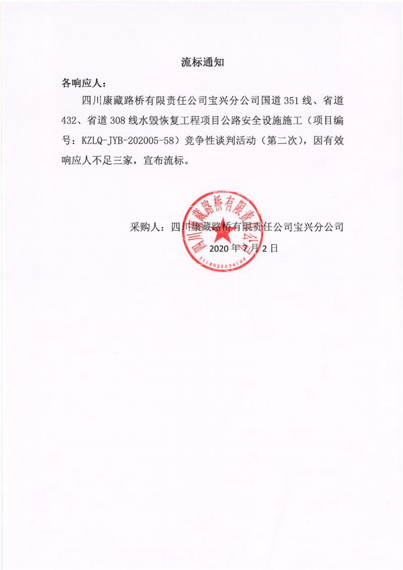四川康藏路橋有限責(zé)任公司寶興分公司國道351線、省道432線、省道308線水毀恢復(fù)項(xiàng)目公路安全設(shè)施施工競爭性談判(第二次)流標(biāo)通知