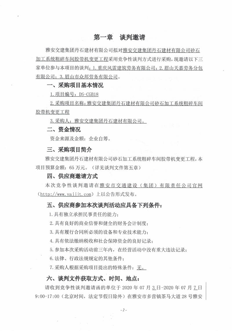 雅安交建集團(tuán)丹石建材有限公司砂石加工系統(tǒng)粗碎車間膠帶機(jī)變更工程競(jìng)爭性談判邀請(qǐng)公告