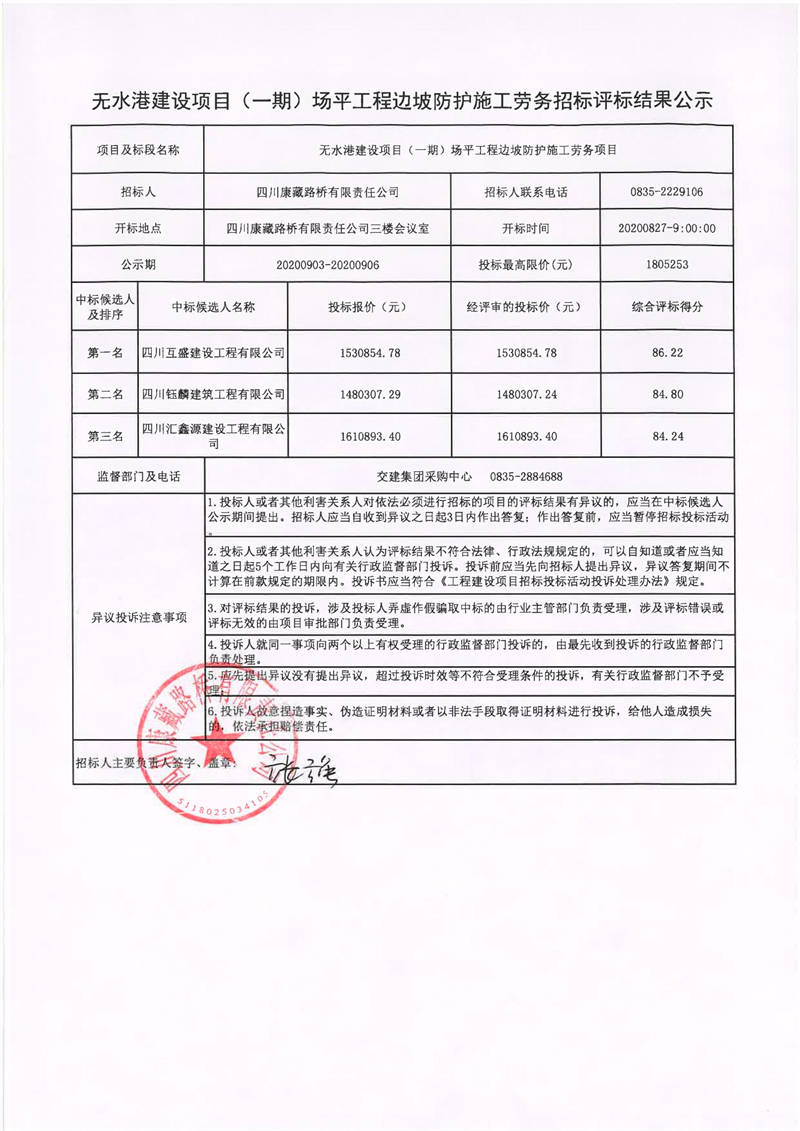 四川康藏路橋有限責(zé)任公司無水港建設(shè)項(xiàng)目(一期)場(chǎng)平工程邊坡防護(hù)施工勞務(wù)招標(biāo)評(píng)標(biāo)結(jié)果公示