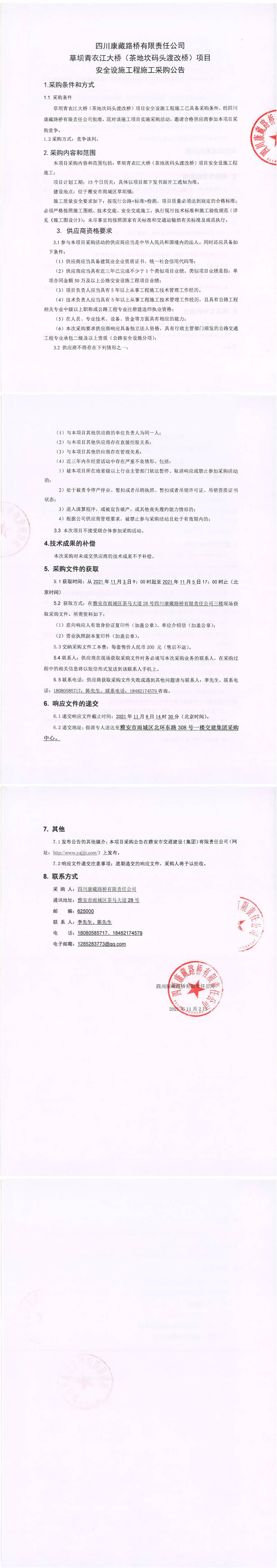 四川康藏路橋有限責(zé)任公司草壩青衣江大橋(茶地坎碼頭渡改橋)項目安全設(shè)施工程施工采購公告