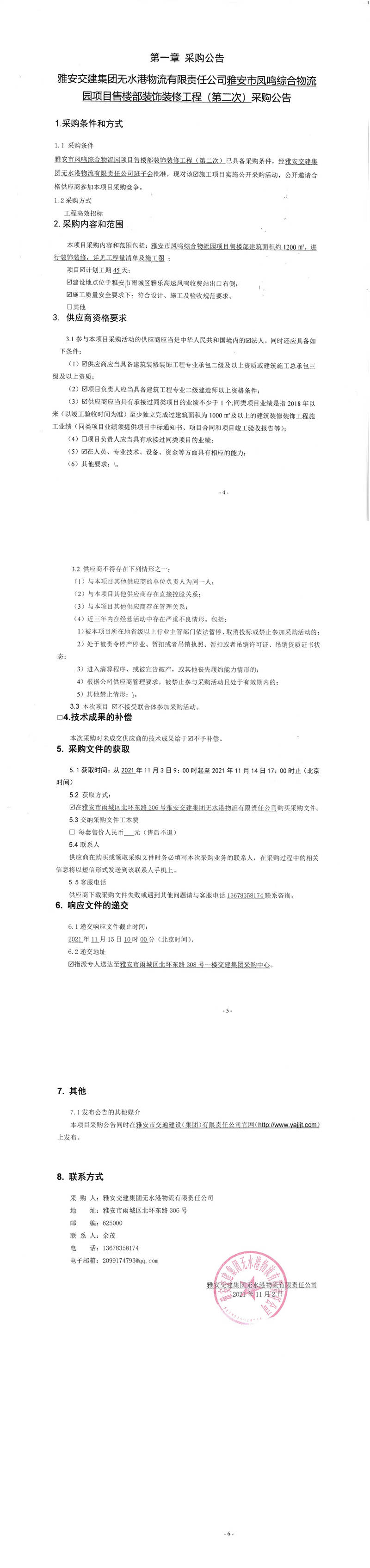 雅安交建集團(tuán)無(wú)水港物流有限責(zé)任公司雅安市鳳鳴綜合物流園項(xiàng)目售樓部裝飾裝修工程(第二次)采購(gòu)公告
