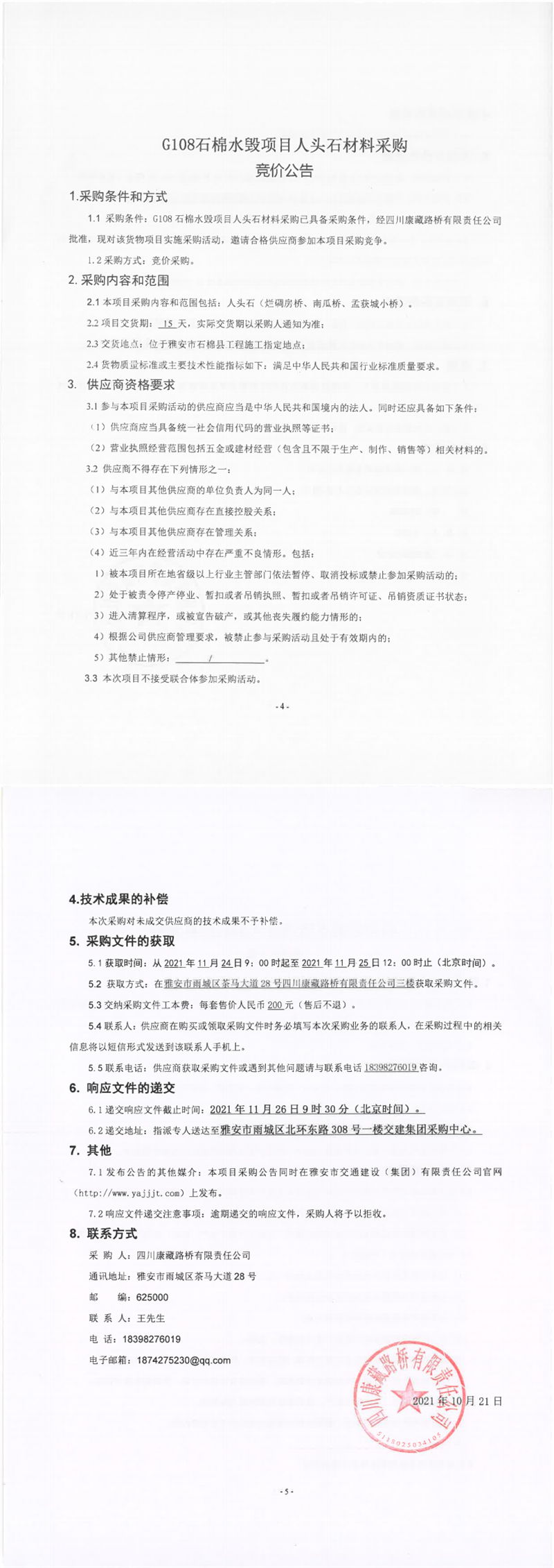 四川康藏路橋有限責任公司G108石棉水毀項目人頭石材料采購競價公告