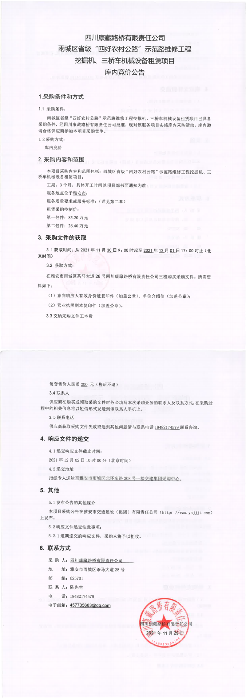 四川康藏路橋有限責(zé)任公司雨城區(qū)省級“四好農(nóng)村公路”示范路維修工程挖掘機(jī)、三橋車機(jī)械設(shè)備租賃項目庫內(nèi)競價公告